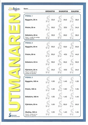 Jo, UTMANAREN är en jätterolig tävling för våra simmare. Man börjar med att simma 25 meter, därefter 50 och till sist 100 meter. Man kan simma alla fyra simsätt om man vill, eller så väljer man ut de simsätt man tycker är roligast. Efter varje tävling får man diplom. Om man uppfyller de mål och tider som finns så får man klistermärken att sätta på ett till diplom (se bild), och när man uppfyllt alla tider/mål på 25, 50 och 100 meter så får man en pokal. Totalt kan man få upp till 3 pokaler, och när man fått dessa, så har man klarat av hela UTMANAREN!