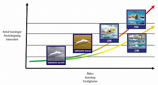 Principen är att i takt med att man utvecklar sina färdigheter och byter nivå i Simlinjen, så ökas antalet träningar, träningstid och träningens intensitet.