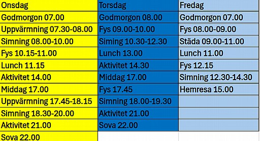 Egen Lunch på Fredagen när vi åker, sen kommer vi stå för frukost, lunch, frukt och middag under lägret.